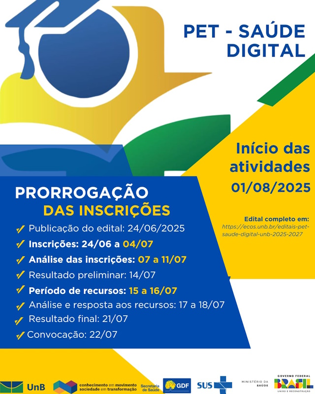 Editais 01/2025 PET Saúde Digital UnB 2025-2027 Inscrições prorrogadas até o dia 27/06! A Universidade de Brasília (UnB), por meio da Coordenação do Projeto PET Saúde Digital,...Leia mais
